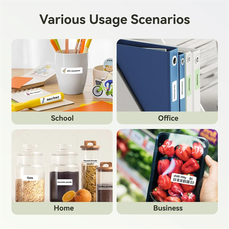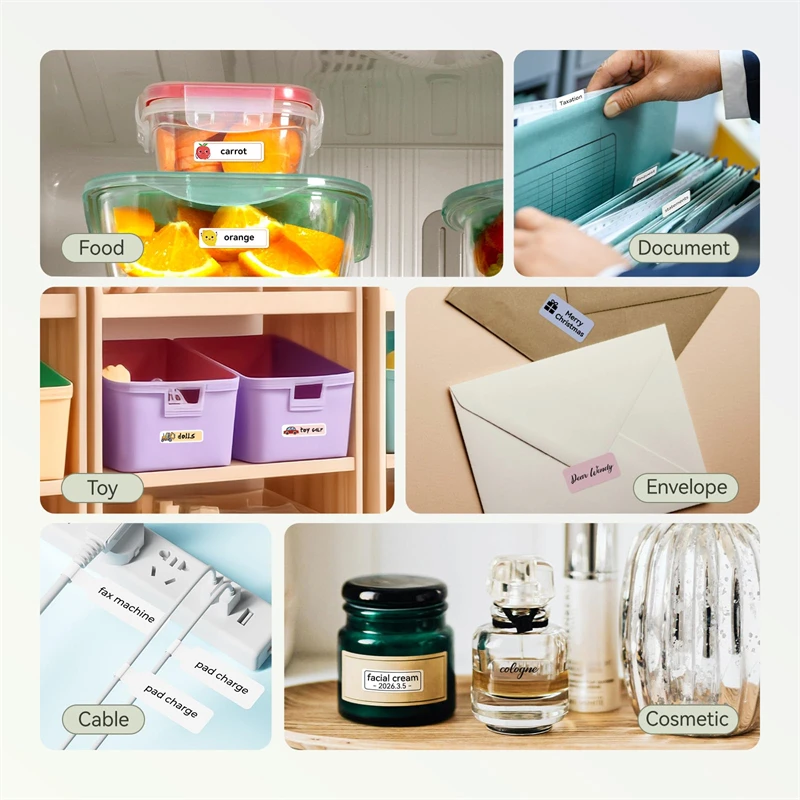 The label maker printing width up to 15mm with a variety of styles of label tapes widely used in home storage and organization, school and office file classification, and small business, such as jar stickers, food date, cosmetics, personal items, name tags, cable identification, price tags, jewelry labels, etc. It’s also the perfect back-to-school supplies and home helper.