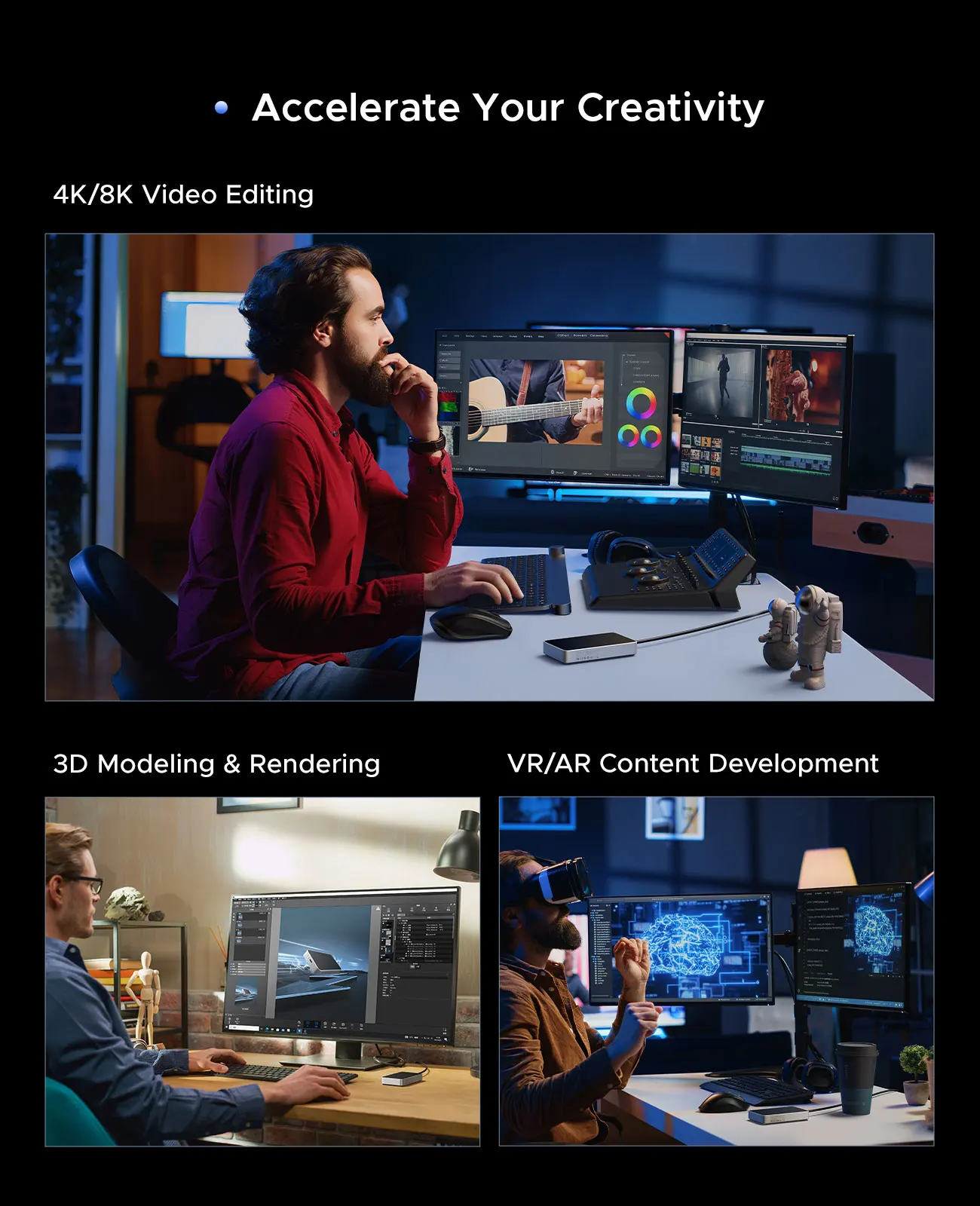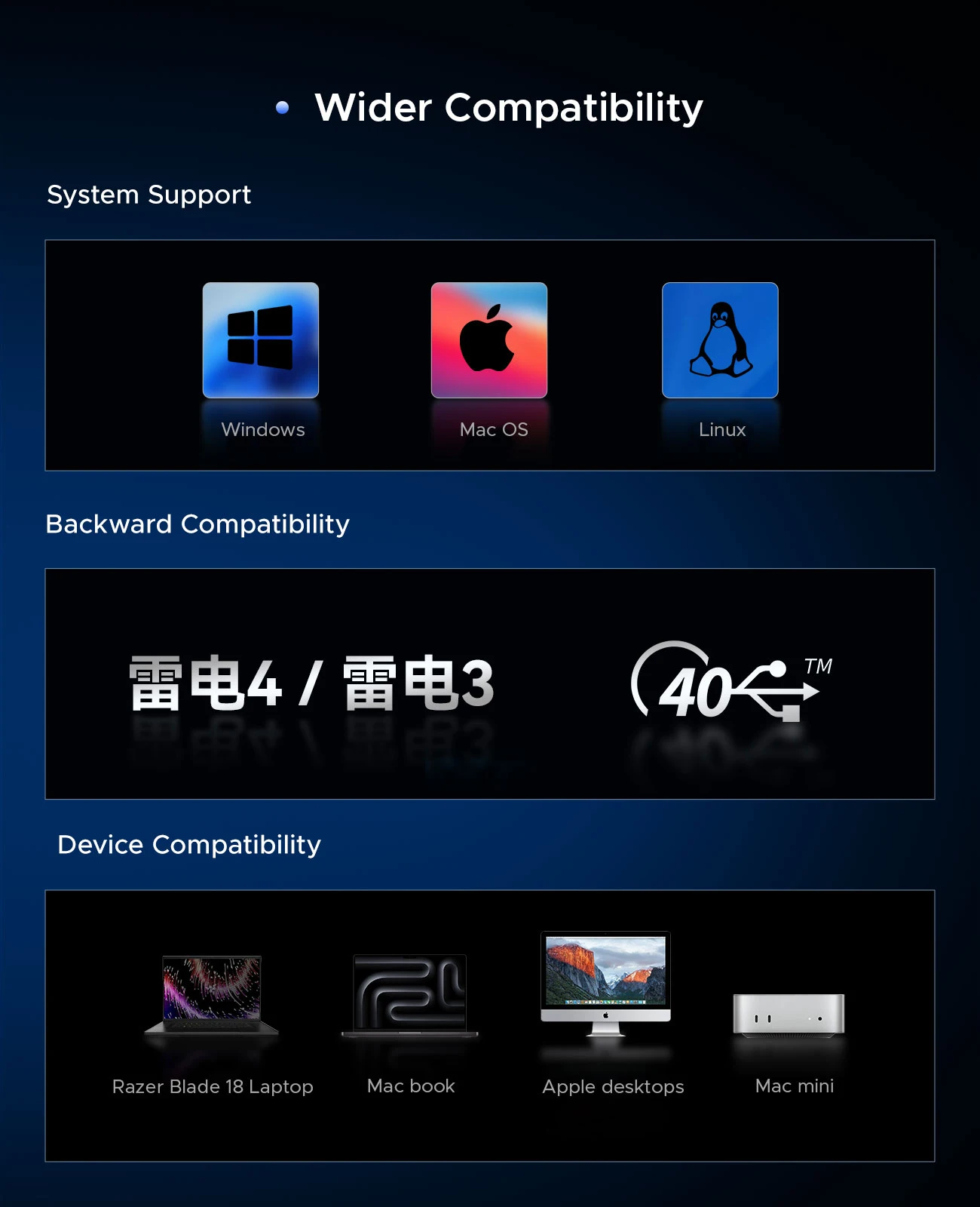 Thunderbolt 5-compatible chip to ensure compatibility and stability, supports transmission rates up to 80Gbps , and provides an extremely fast data transmission experience