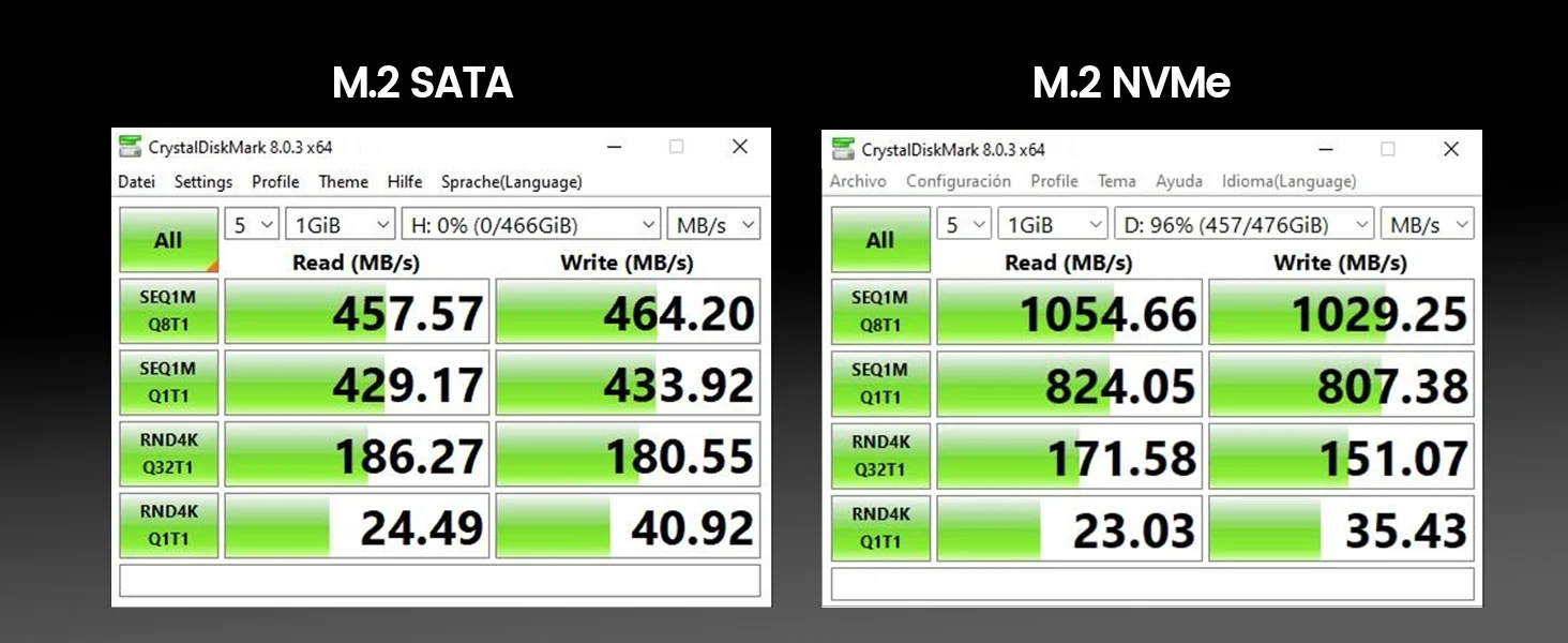 When using NVMe SSD, the transmission rate is 10Gbps and the read and write speed is 1000MB/s. When using M.2 SATA SSD, the transmission rate is 5Gbps, and the reading and writing speed is 450MB/s.