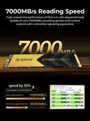 The ORICO O7000 NVMe SSD utilizes NVMe 2.0 technology and PCIe Gen 4x4 interface, with advanced NAND flash memory to boost computer speed, improve game loading times, and enable faster data transfers.