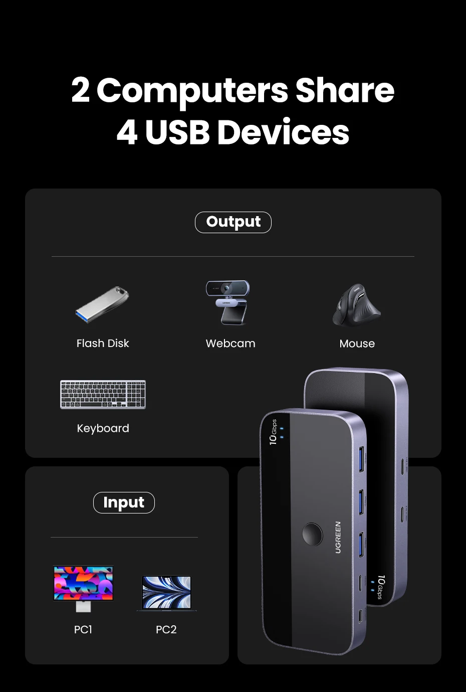 UGREEN 10Gbps USB C Switch USB C 3.2 Switcher for PC Keyboard, Mouse, Printer and Scanner 2 PCs Sharing 4 Devices USB Switch
