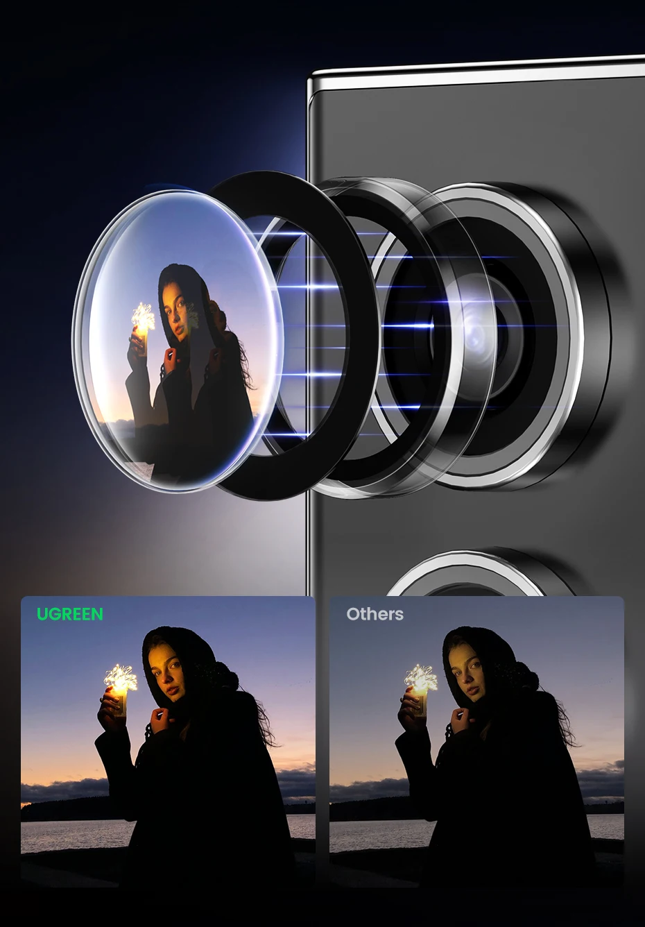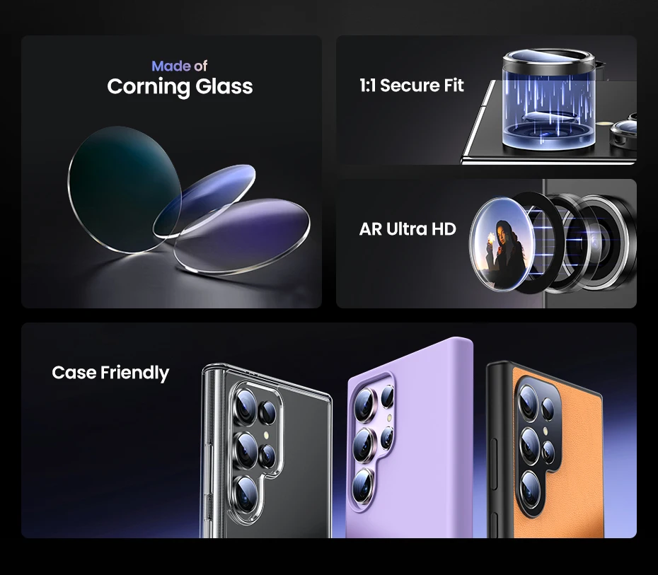 UGREEN Camera Protector is made of Corning glass as raw material ,which has ultra-high light transmittance; it uses AR anti-reflection technology to solve the problem of lens glare and ghosting after taking pictures with a protective film on them from the source.
