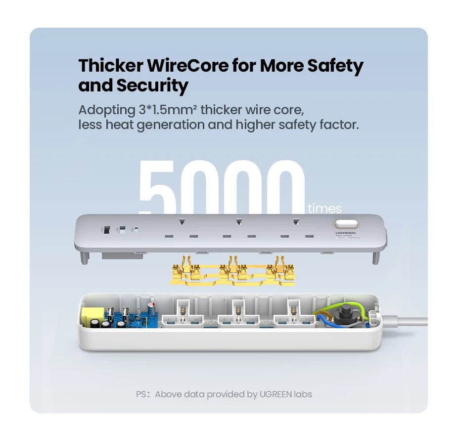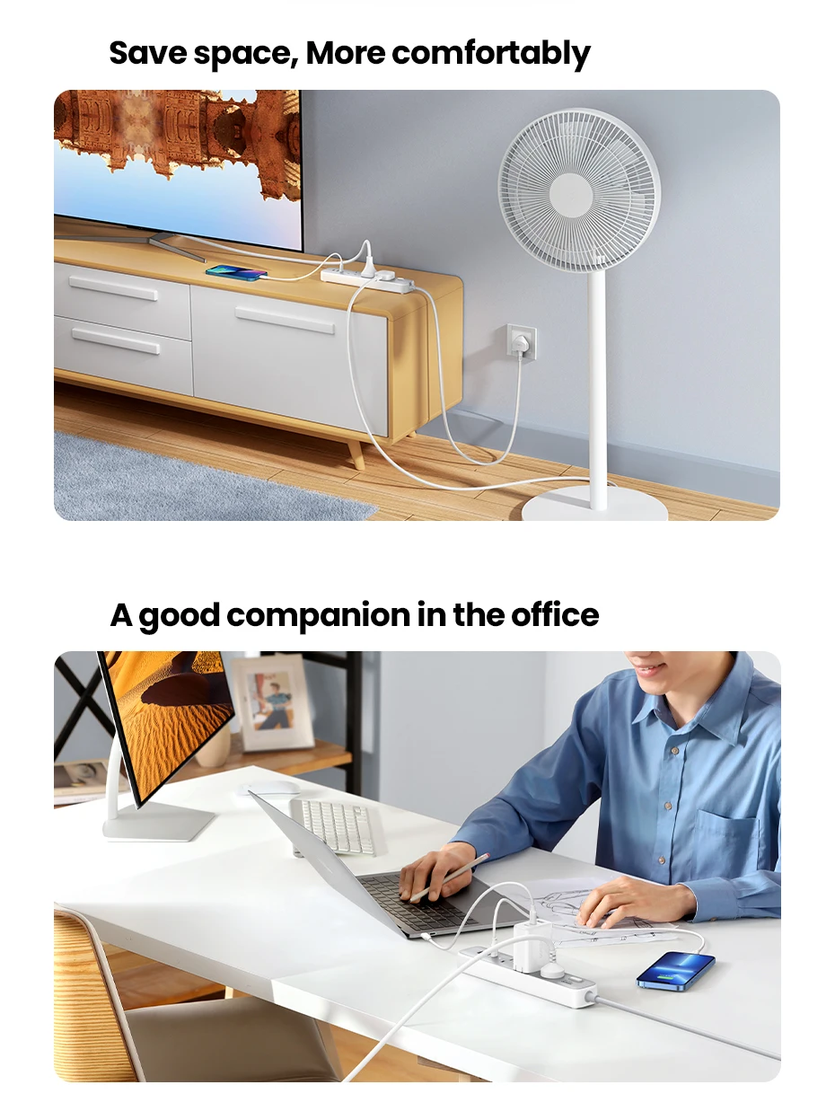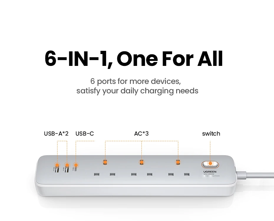 6 ports for more devices:3 AC Outlets+ 2 USB A Ports+1 USB C Ports