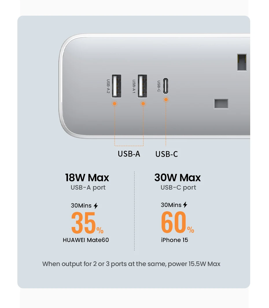 1.30W Max Output for USB-C Port:30Mins charge to 60% for iPhone 15.