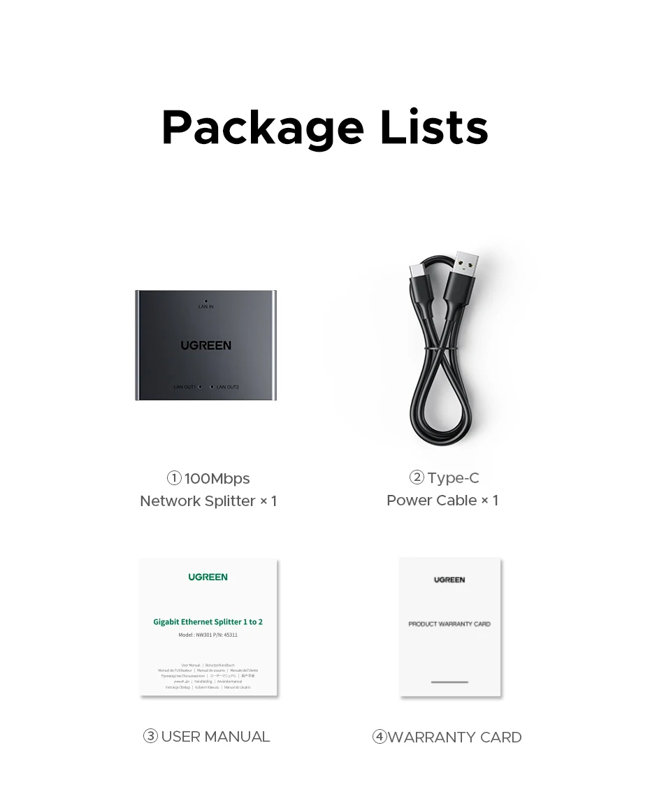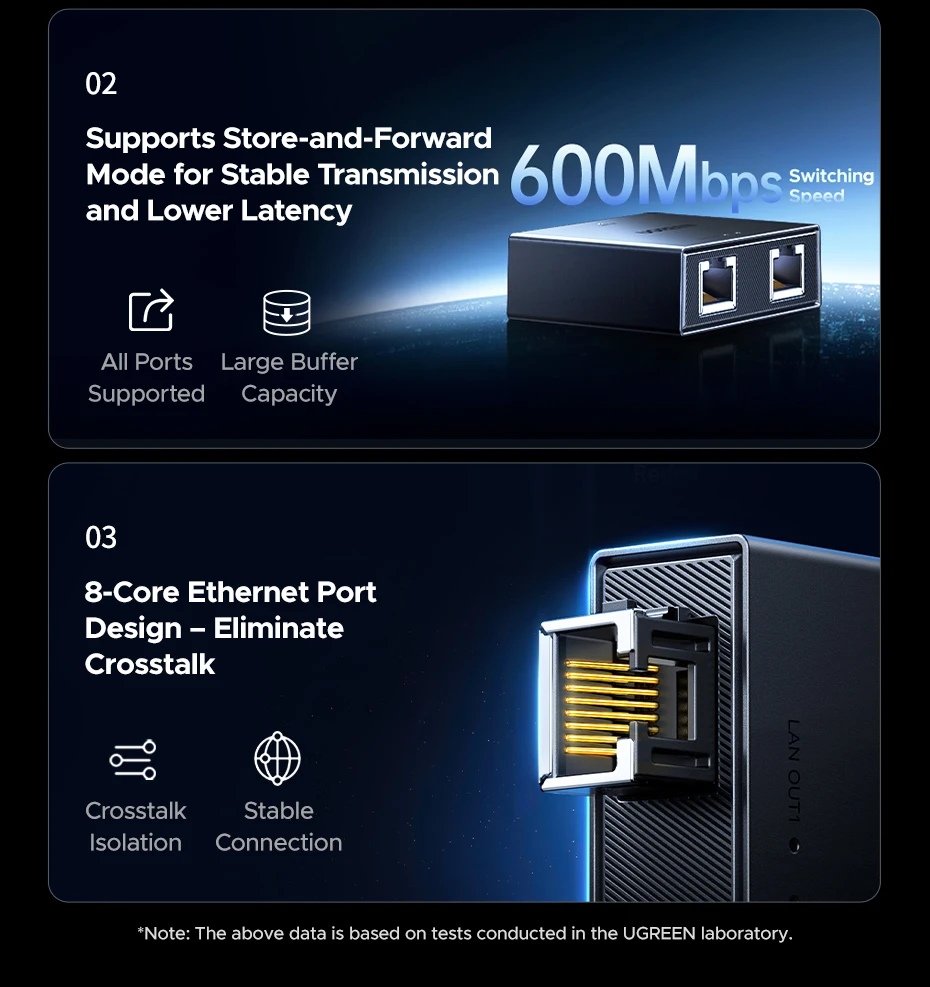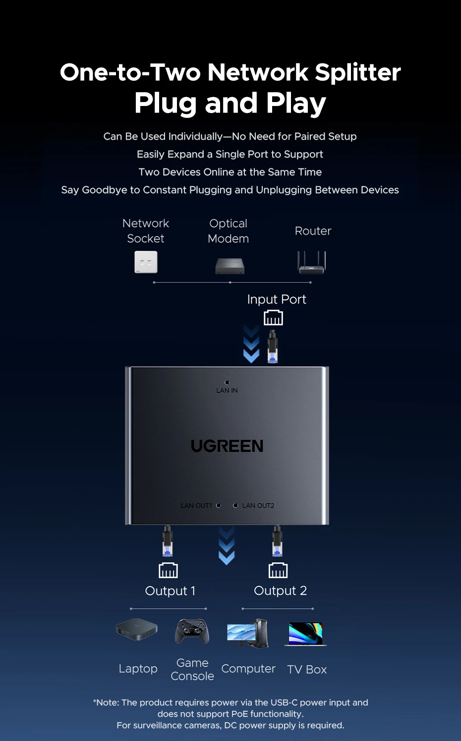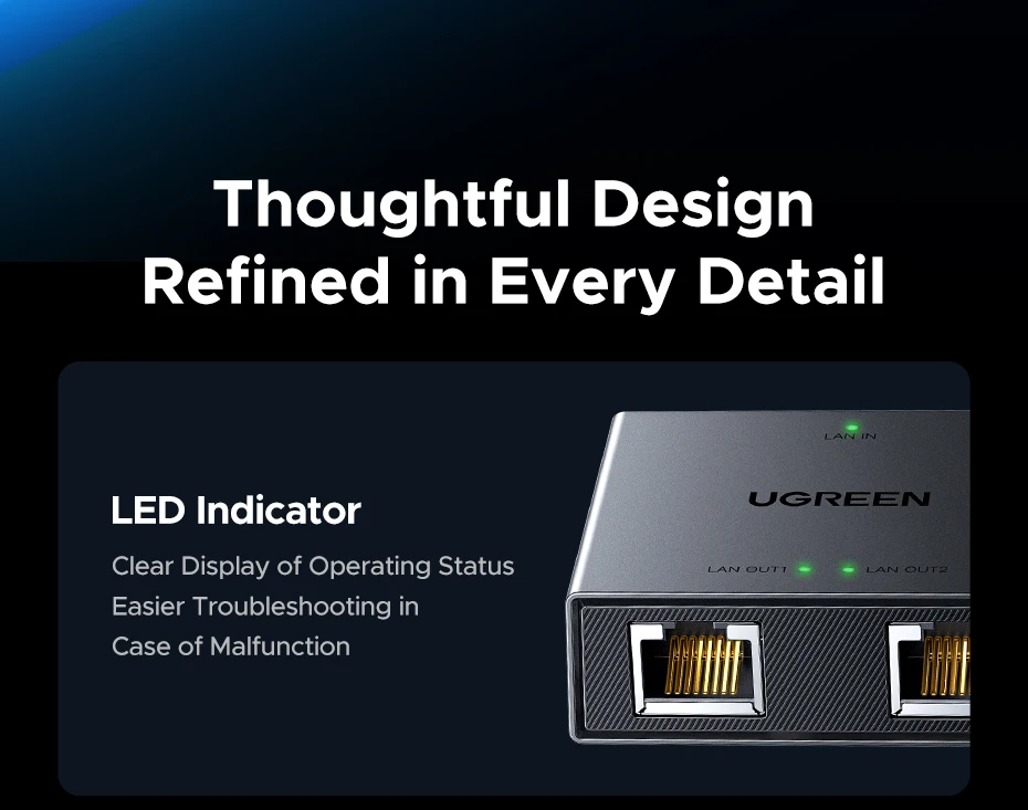 UGREEN Ethernet Splitter 100Mbps 1 to 2 RJ45 Splitter Ethernet Adapter Lan Connector Switch Coupler for PC Laptop TV Box Router