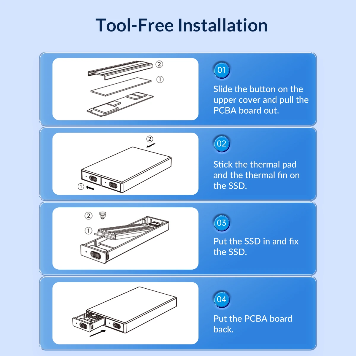 All Aluminum alloy body with sliding SSD tray, tool free Installation. Make installation faster and more convenient.
