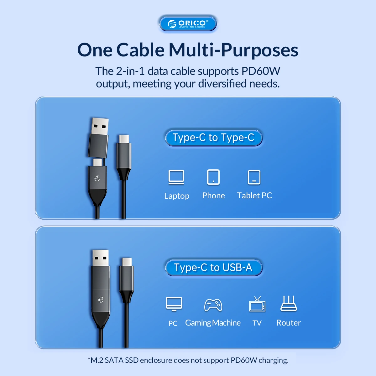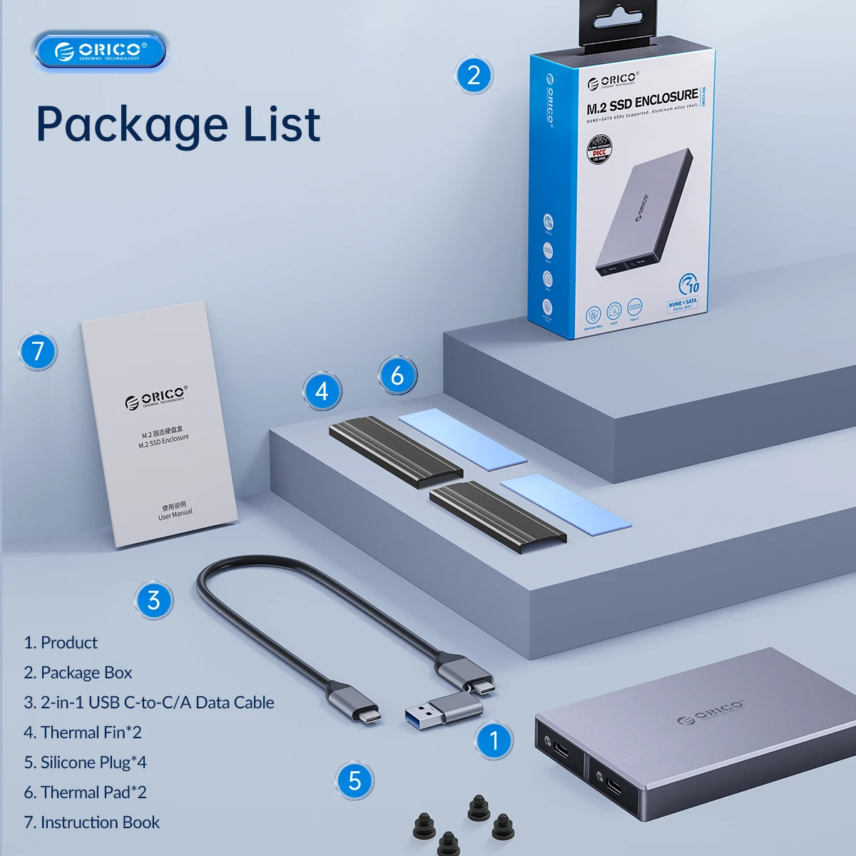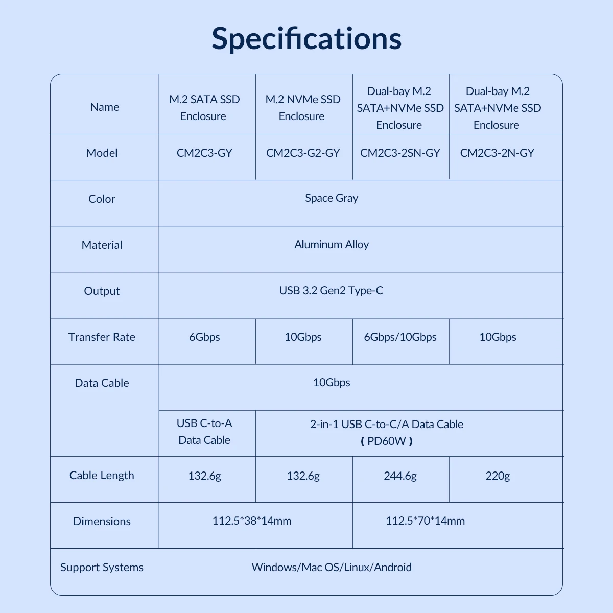 Only support NVMe PCI-E protocol M key/M&B Key SSD, with 30cm C to C/A 2-in-1 date Cable.
