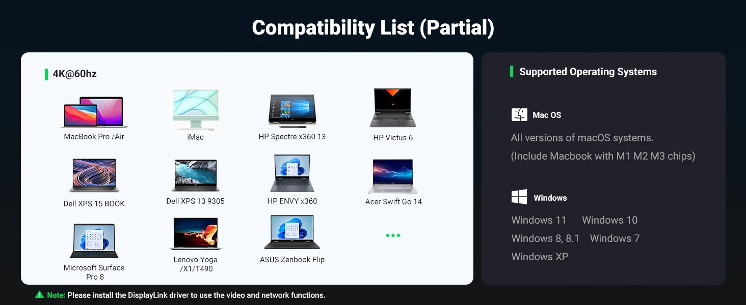 · Multi-Extended Modes for macOS: Boost your work efficiency with the UGREEN USB-C Docking Station's DisplayLink Technology to extend dual 4K@60Hz monitors for macOS and Windows systems. Choose between extended or mirrored display modes effortlessly. (Driver installation required for display and network functions)