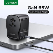 UGREEN 65W GaN Universal Travel Adapter 2 USB-C 1 USB-A AC Socket Charger Certified CE FCC UKCA TÜV For EU US UK Grounded Plug