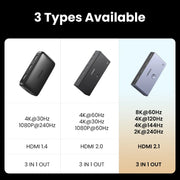 UGREEN HDMI 2.1 Switcher 8K 60Hz 4K120Hz HDMI-compatible Switch 3 in 1 Out with Remote Control Converter For Xbox PS5 Monitors