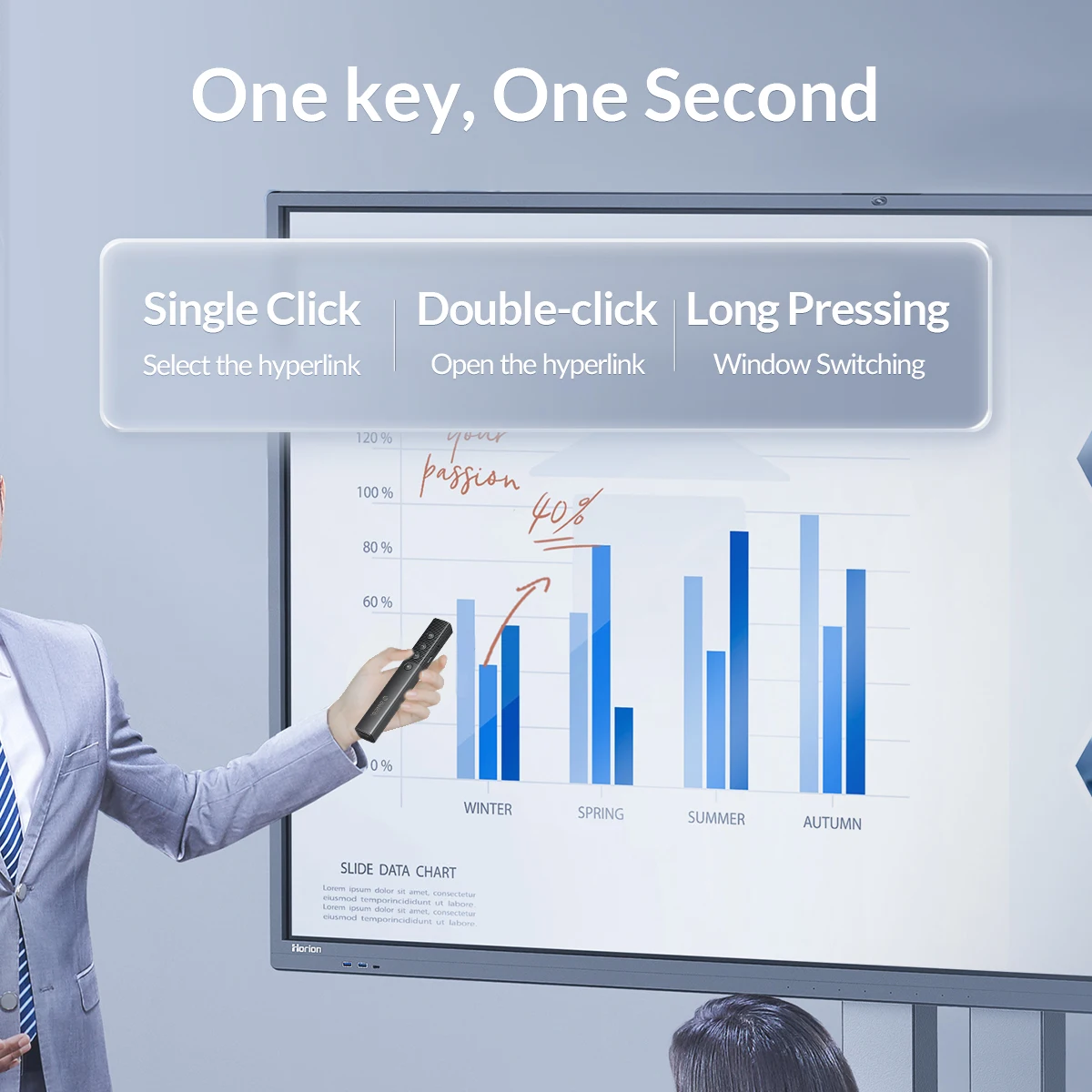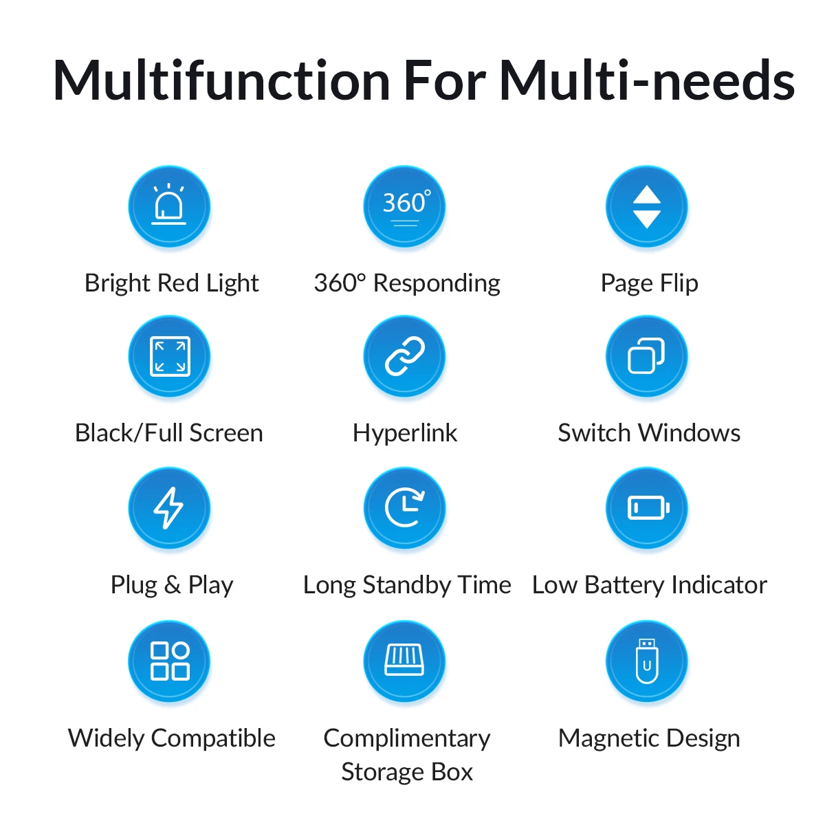 2.One-touch slideshow controls,Press forward or back to move through your slides. Press the laser pointer key to highlight your point.