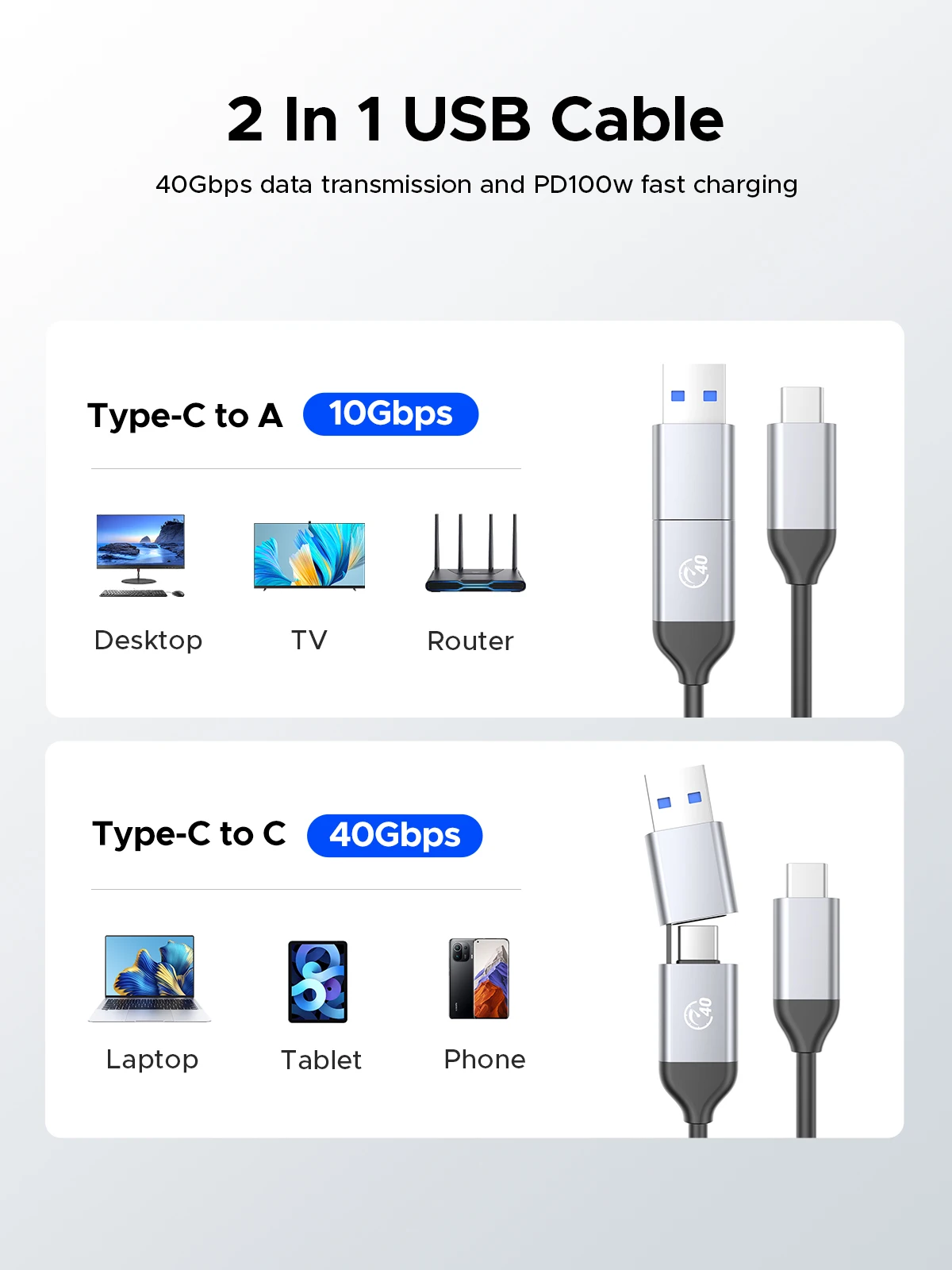 40Gbps data transmission and PD100w fast charging.NOTE:The included USB cable has 2 output ports, USB C to A (10Gbps/QC15W) and USB C to C (40Gbps/PD100W)Intelligent Indicator Light