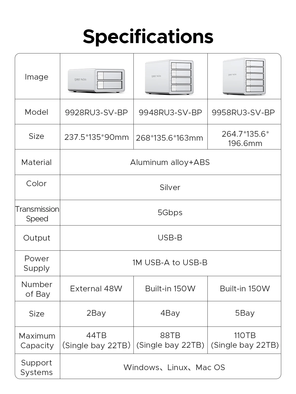 2Bay/ 4Bay/ 5Bay Capacity: 44TB/88TB/110TB (Single bay 22TB Max)