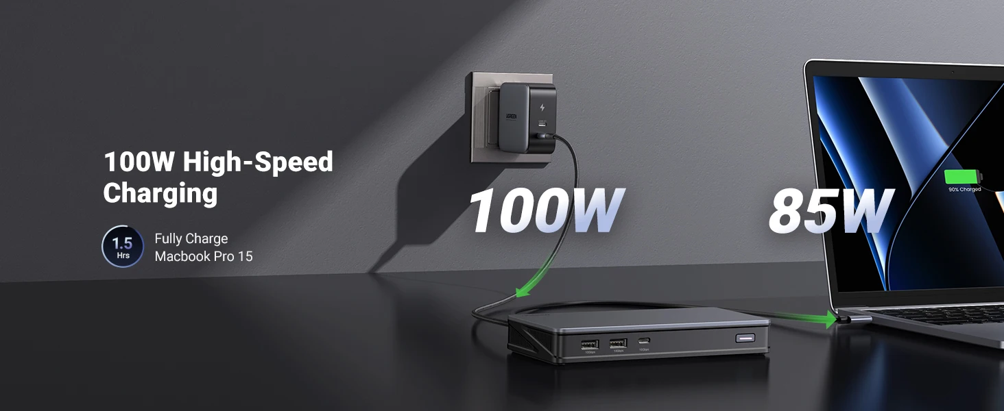 · PD 100W Fast Charge: The Laptop Docking Station comes with a powerful 100W PD 3.0 charging port, allowing you to charge your MacBook Pro 15'' in just 1.5 hours with no need for an additional port.