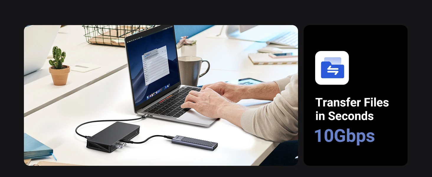 · Lightning-Fast Data Transfer: Experience lightning-fast data transfer speeds with 2x USB-A 3.2 Gen 2 and 1x USB-C 3.2 Gen 2 ports, offering up to 10 Gbps. Transfer files, videos, and more in seconds, making daily expansion and data transfer a breeze.